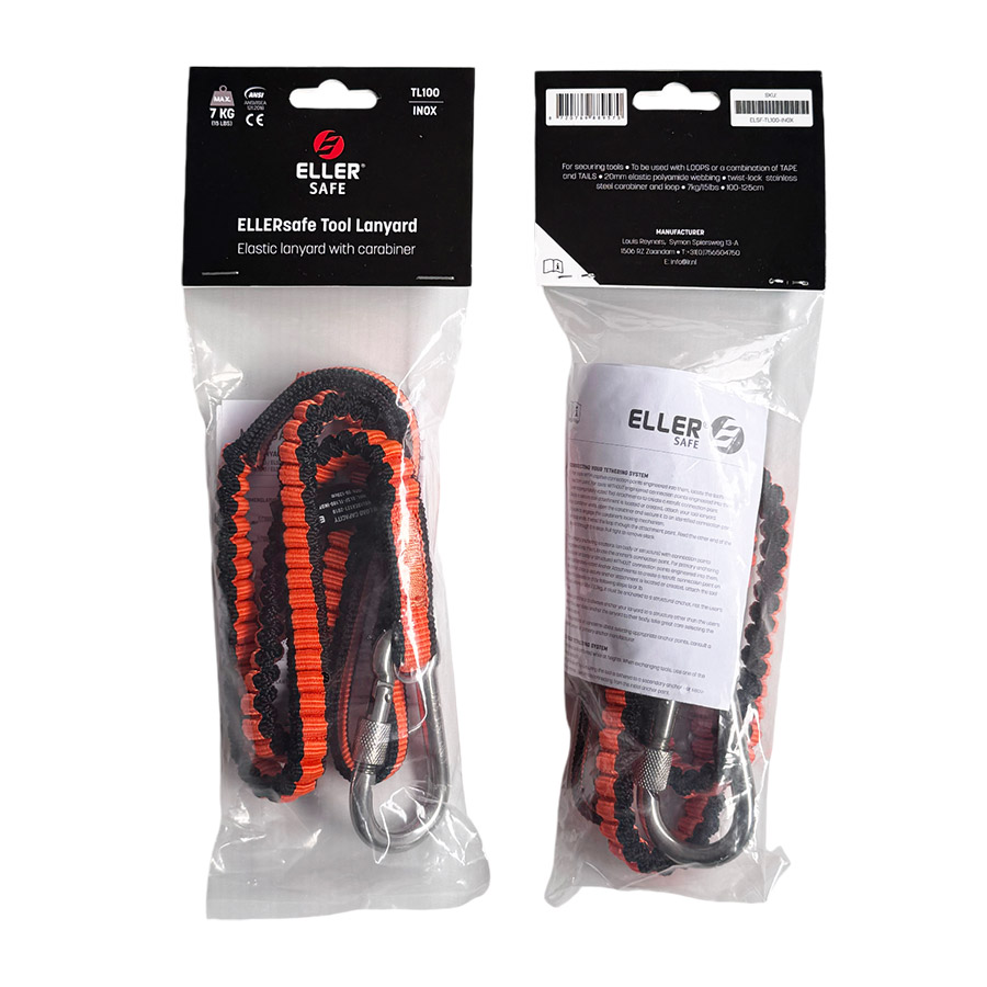 The ELLERsafe TL100-INOX tool lanyard is designed for safely holding tools at height. It consists of 15mm elastic polyester webbing and a small twist-lock carabiner, manufactured from 304 stainless steel, and loop, forming the attachment mechanism. With a maximum working load of 7kN, it is suitable for a range of tools. The length of the tool lanyard can stretch between 100cm and 125cm.